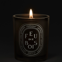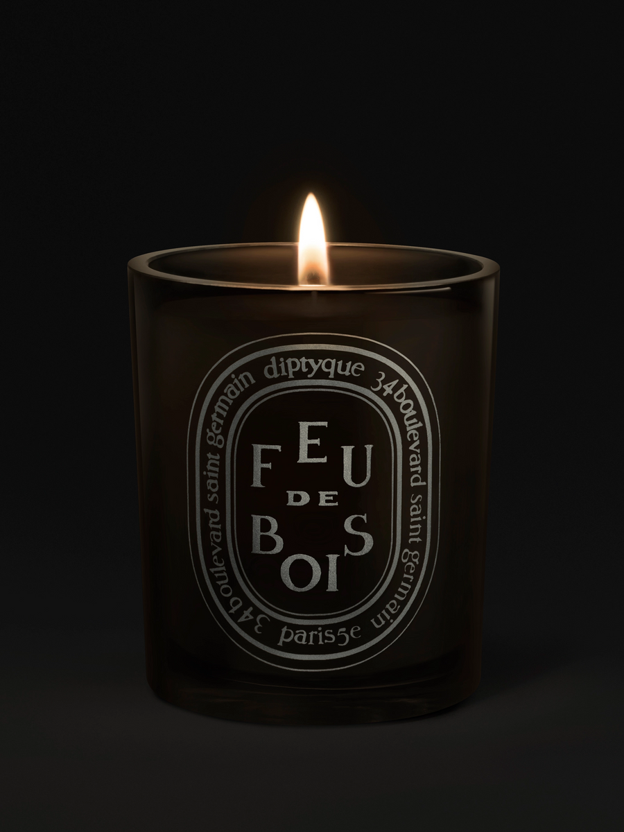 Den klassiske Feu de Bois duften fra Diptyque i et større, farget glass.