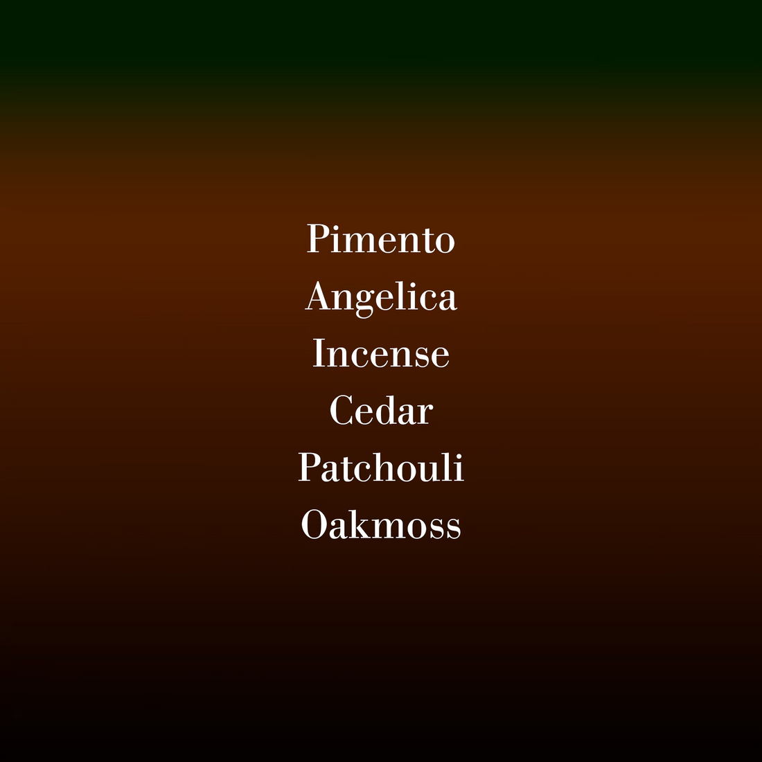 Den krydrede friskheten av pimiento, angelika og einebær smelter sammen inn i en treaktig base av sedertre, patchouli og vetiver med galbanum og røkelse.