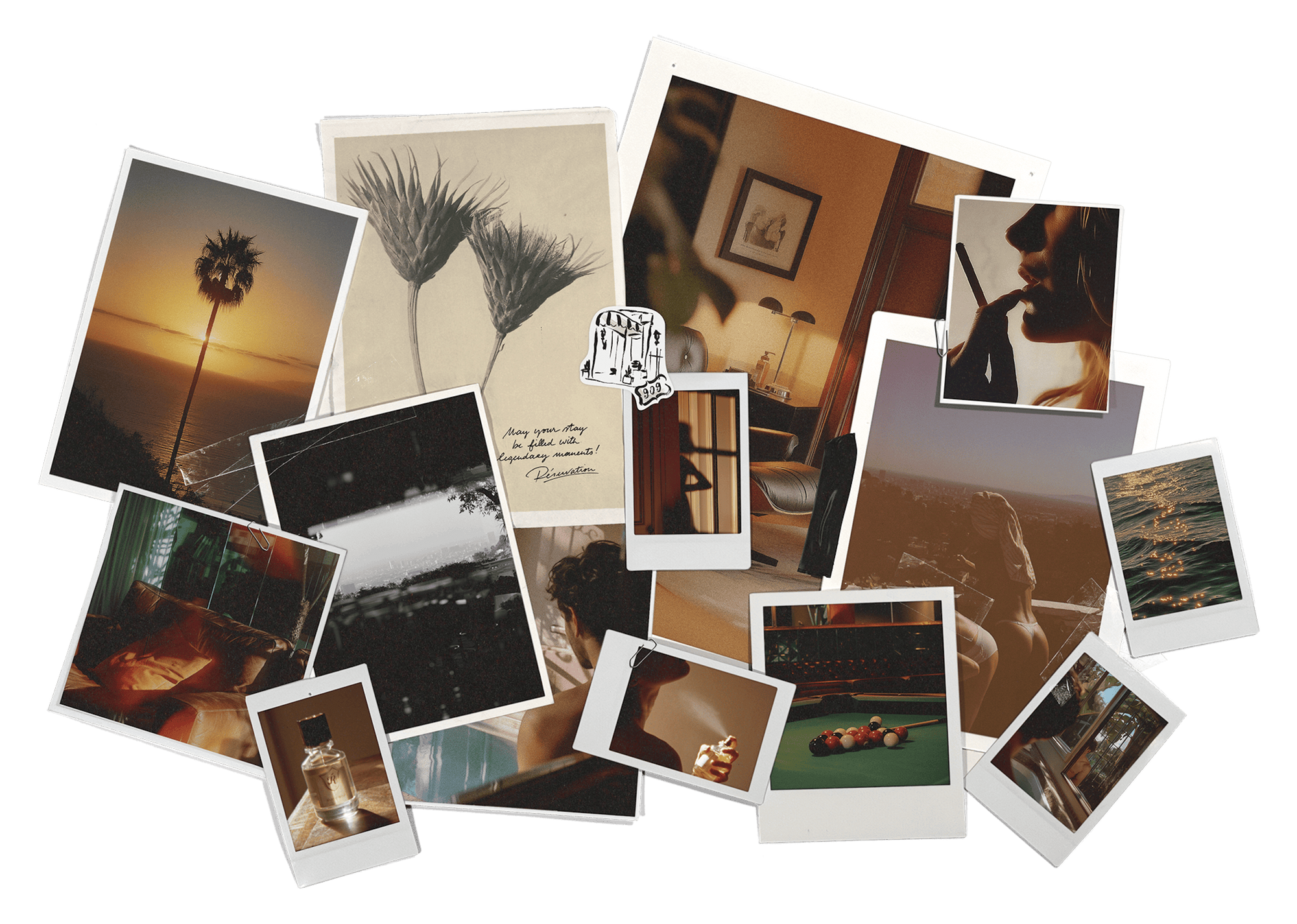 Suite 909, alltid. Sedertre og semsket skinn i en solbleket California. Bak lukkede dører er ørkenvinden fortsatt tung i luften, mens byens puls vibrerer gjennom veggene. Polert tre, lær og sitron. En lekeplass for drømmerne som aldri vil våkne.